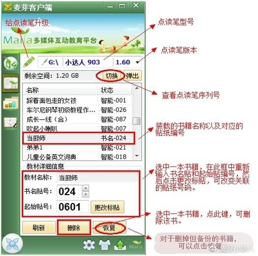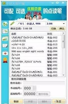 点读笔内容管理:点读笔连接电脑后,打开小达人客户端,选择右边竖排二项内容管理,软件会将点读笔内所有已安装点读包显示出来,在这里可以对安装好的内容进行删除,修改书名贴号等操作。