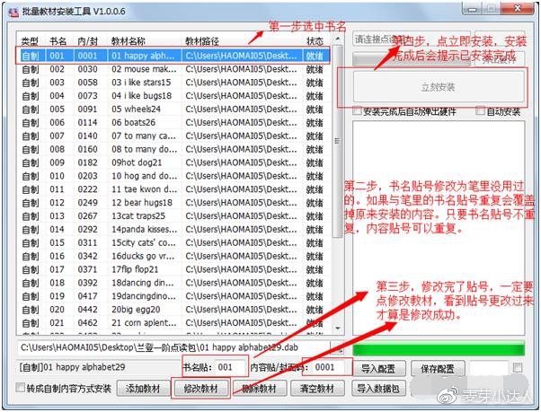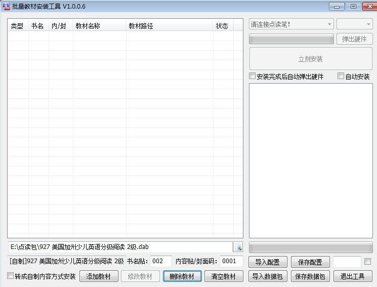 d导入完成后,在客户端内容管理里先查看下点读笔安装的书名贴号,新安装的点读包书名贴号不能与笔里的重复,如果重复会将笔里相同书名贴号的内容覆盖。如果不小心覆盖了,可以将原来的点读包再重新安装一次。