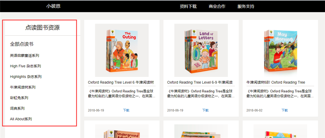①进毛毛虫官网(数据包页面):http://www.hungrycaterpillar.cn/download/list/rhyme,在页面左侧对全部点读包资源进行了分类,下面以“牛津阅读树系列”为例;