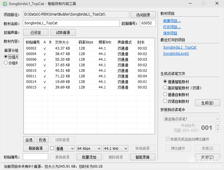 教材内容:需要根据每句话读出的编号,填写到左下角的标贴编号,然后点击添加音源,浏览对应的mp3文件。每句话都要重复这个步骤添加进去。