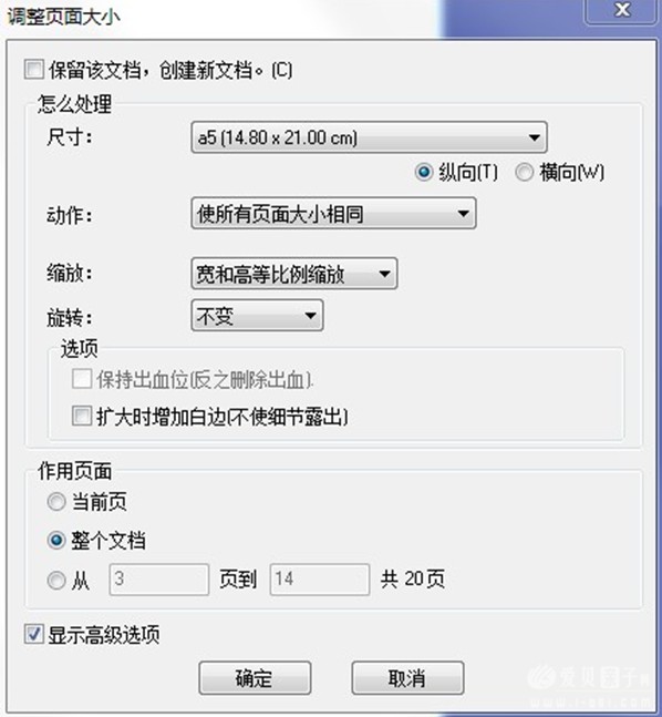 将pdf文件转换成适合拟打印的纸张大小,最好是按比例缩放,减少变形。本例拟采用A4纸双排打面,即A5规格,21.0X14.8。该功能也是由QI3+实现。其界面如下: