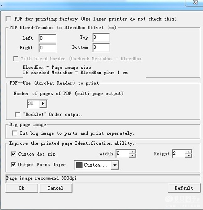 Custom dot size后面的数值根据个人打印机打印测试页后点读笔的识别情况设定,一般2X2。按OK返回上一个对话框,点output file就可以输出铺好码的pdf文件了。这时得到的是每个页面为一个文件的一堆pdf文件。如果要打印成小册子的话,即在一个A4打印两个页面,在中间装订后对折成A5大小的册子的话还需把pdf文件合成为一个文件。