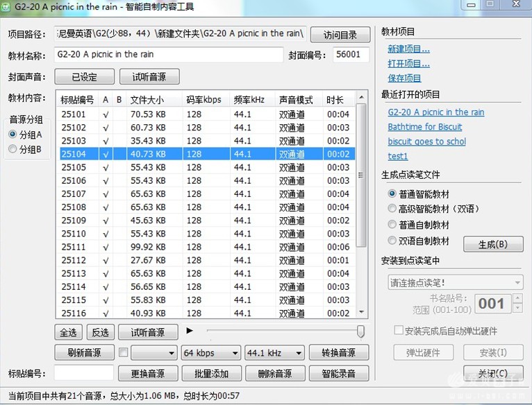 在以上窗口中设置好目录,名称,导入原先切割好的音频文件,就可以生成点读包了。