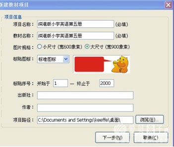项目名称只是本地保存的名称,教材名称为制作好以后,安装到点读笔里点读笔显示的名称,可以一样,也可以不同。选择项目路径,默认的是软件的安装目录,您可以选择保存到一个比较好找的地方,我就放到桌面上。点下一步。