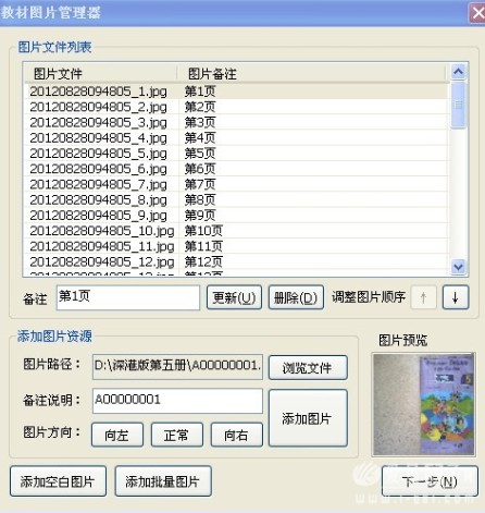 如果是制作卡片或者一幅图的时候,可以单张图片添加,点浏览文件,选择该图片项目路径添加就好了。另外也可以添加空白图片,把很多的声音都拖入空白图片中。我们现在是一本书,所以批量添加。点批量添加图片,选择刚刚拍照的图片文件夹,打开,全选所有图片,添加就ok了,软件会自动按照你的文件名称帮你排序。添加完图片之后点下一步。