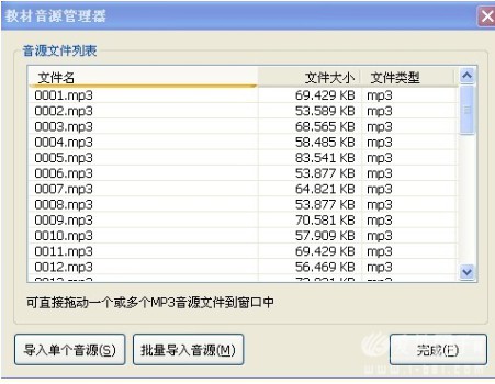 系统自带了一个封皮音,如果不更改封皮音就会默认使用cover.mp3。可导入单个音源,也可以批量导入。我选择批量导入,完成之后如下图。这样我们的导入工作就完成了。点完成。
