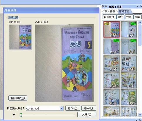 首先先看到界面右边,选择一张图片设为封面。系统一般默认第一张图片为封面。点属性,就可以更换封皮声音。如下图,导入一个新的封皮声音,然后点击修改就可以了,导入后还可以试听。