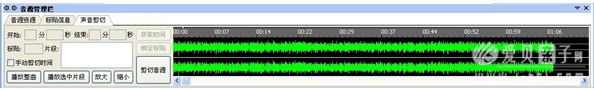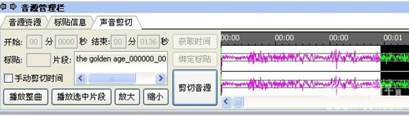 进入到声音剪切页面后如下图所示。点放大就把这段的波形图放大,可以精确的剪切。选择一段声音,可以播放选中片段,一边听以便选择,对照着图片看是哪句的音频。