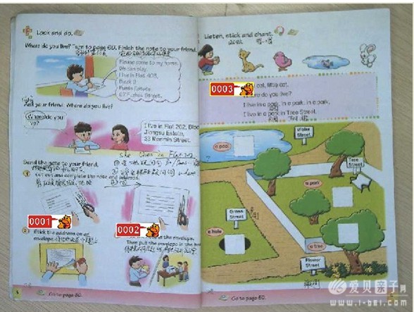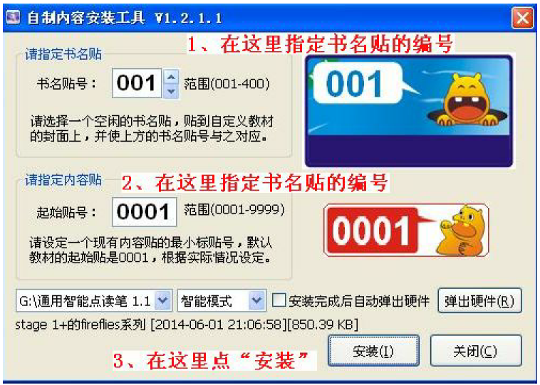首先根据刚才安装点读包时选择的书名帖编号,比如 001,将这个书名帖 001 帖在书的封面。然后按照刚才安装点读包时选择的内容帖编号,如 0001 贴在内容的对应位置上。