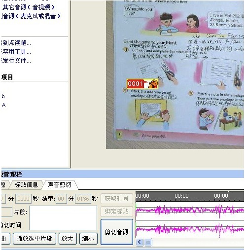 将该声音拖到书本的相应位置如图所示,就会显示0001标题,以此顺序剪切下去,一本书就做好了。如果该段音源剪切完毕,想要剪切下一段,只需要选择未用音源,选择下一个要剪切的声音,点剪切音源就可以重复刚才的步骤了。
