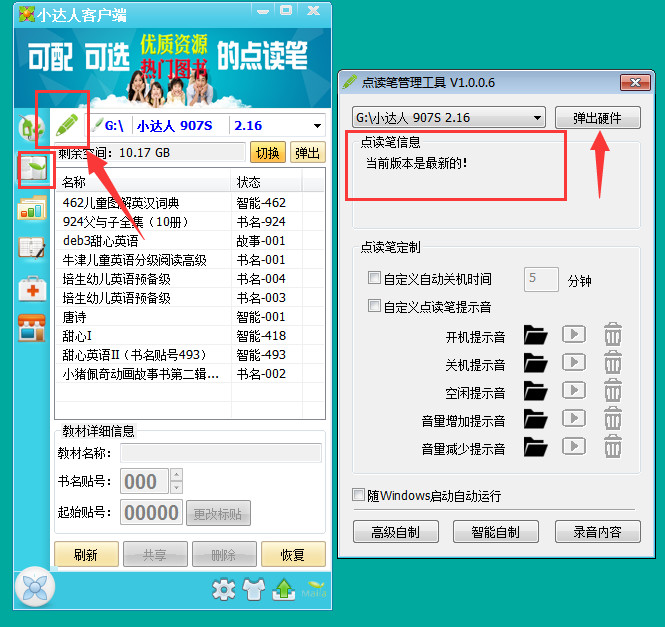 将点读笔连接到电脑上面,启动客户端,打开左边一列第二个“内容管理”,点里面上方的绿色笔图标,然后就可以查看点读笔是否可以升级。如果可以升级的话,点页面里面的升级,进度条满了之后点上方弹出硬件,将点读笔跟电脑断开连接,小达人点读笔开机会听到“小达人升级”,这时务必不要对点读笔进行其他操作,等提示升级完成以后,就可以开机使用啦~ 标签: 小达人 绘本 幼儿早教 点读笔 点读包 少儿英语 早教资源 少儿读本 未经允许不得转载:无忧学习网 » 连接小达人客户端的时候提示请连接点读笔?