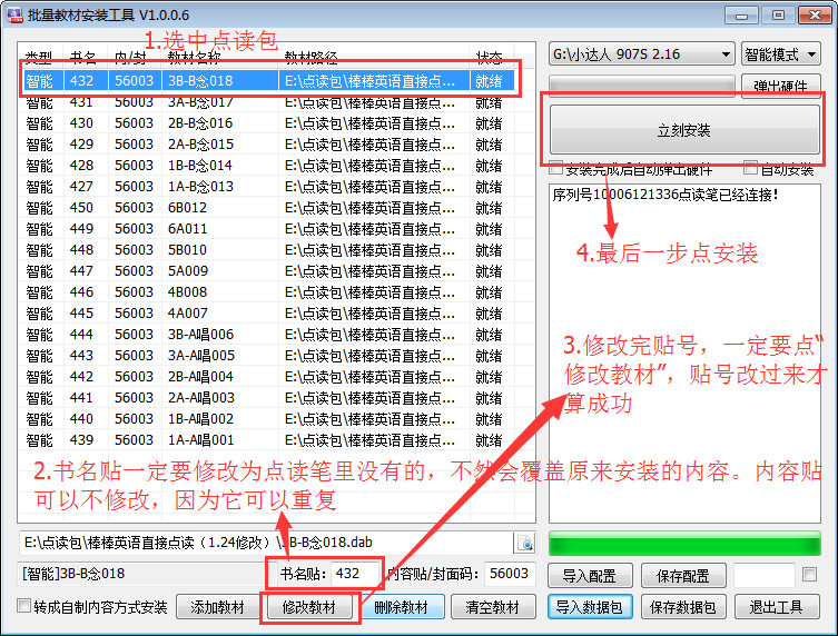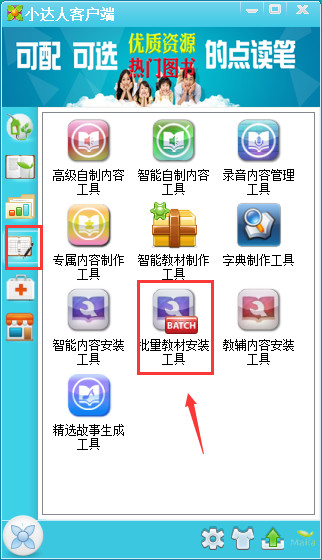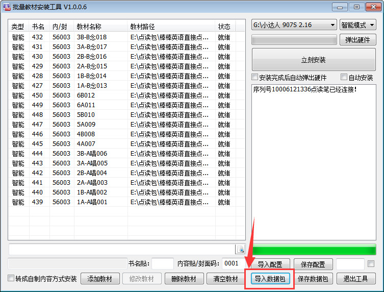 BAB格式的是批量点读包,将多个点读包打包成一个大的文件安装包。步骤:点读笔关机连接电脑,进入小达人客户端,点击左侧第四个图标,选择批量教材安装工具,双击打卡,选择“导入数据包”。导入完成后,在客户端内容管理里先查看下点读笔安装的书名贴号,新安装的点读包书名贴号不能与笔里的重复,如果重复会将笔里相同书名贴号的内容覆盖。如果不小心覆盖了,可以将原来的点读包再重新安装一次。 标签: 小达人 绘本 幼儿早教 点读笔 点读包 少儿英语 早教资源 少儿读本 未经允许不得转载:无忧学习网 » 点读时提示请添加文件?