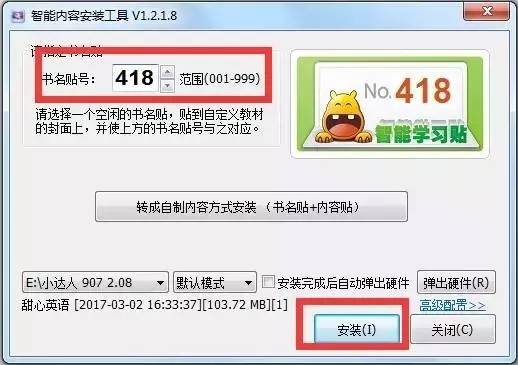 3.双击点读包,会出现如下安装界面。《甜心外语》的书贴号为418,然后把书名贴号改为“418”,再点击安装。