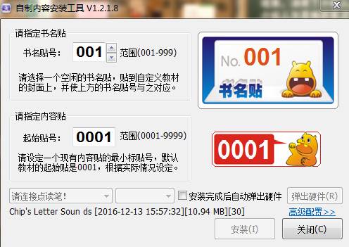 2. 安装点读包时,这里输入书名贴纸的编号为“001”,内容贴纸的编号为“0001”,确认后安装点读包.