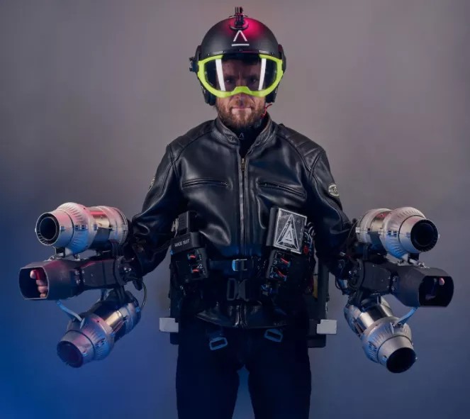 像重力工业做的喷气装置由 6 个喷气发动机、背包、头盔显示器和一套控制程序组成。