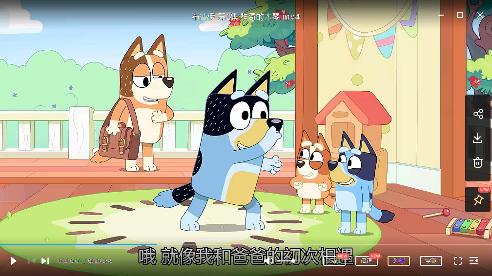 动画片主人公是“一家四狗”,爸爸Bandit,妈妈Chilli,以及姐姐Bluey和妹妹Bingo,妈妈在外工作,爸爸在家带娃。故事全部是日常生活,从中可以学到不少亲子游戏。