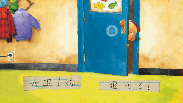 (早上,大卫迟到了,他小心翼翼地推开教室的门,探进调皮的脑袋)