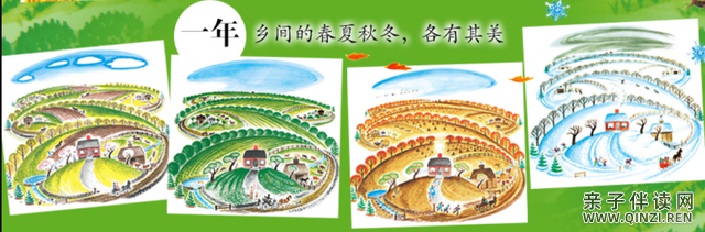 我们再看伯顿的这本《小房子》,同样能看到这样的精益求精,比如在描述小房子周围的四季变化时,虽然大体背景设计是没有变化,但是细细观察你会发现,图片中的人是十分生动,他们在四季中忙碌着,仿佛真的在过自己生活。在勾勒田园生活的四季时,不断选取了鲜艳明亮的颜色,春天是嫩绿色的,夏天是深绿色的,秋天是金黄色的,冬天是银白色的,看得出来绘本中每个部分伯顿都有做过精心设计,小房子拟人化的设计更让讲述视角显得与众不同,《小房子》这本书还有一个很惊喜的小细节,如果你有书,可以看看文字的排列方式,和对应图画的线条走向有着完美的呼应,呈现出一种和谐的美感。