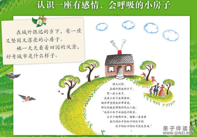这里要请你注意的是,不要问孩子这样的问题,小房子开心吗?小房子喜欢苹果树吗?小房子想去大城市吗?这种问题是封闭式问题,孩子只需要回答是或不是,或者是喜欢,开心,不想去,这样简单的几个字。这样的回答孩子大脑是不怎么需要工作的,对引导孩子思考也就没有什么作用了。