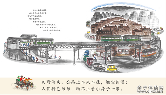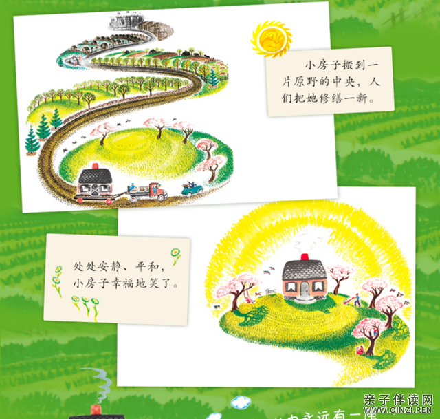 这时候也许《小房子》可以帮助你,当孩子听完了故事,第一反应是,跟着小房子开心,难过再开心,几岁的孩子还做不到主动思考小房子心理过程,和经历背后的含义,但是,我们可以通过故事情节的对比,来对孩子做个引导,启发他想一想。