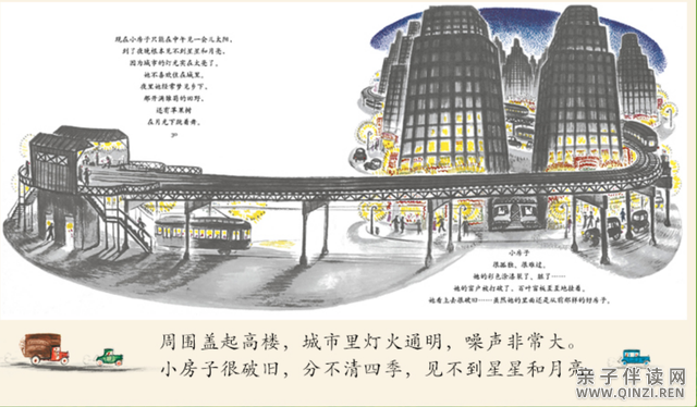 我们来简单回顾一下《小房子》的故事情节,小房子被建在一个悠然美好的小山村里,虽然生活简单,但是充满了小乐趣,她偶尔会在看见远处全是光亮的时候,被城市吸引,后来。小山村被开发成了大城市,当生活在高楼大厦之中时,小房子开始怀念以前的生活,最后,她如愿又回到山村的生活。