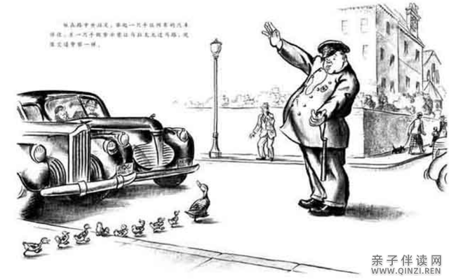 一声响亮的哨音过后,马路上大大小小的车辆都整齐地停了下来,不管是正在走路的行人,还是坐在车子里的人,都目不转睛地盯着马路中央的鸭子一家,这一家子摇摇摆摆从容淡定地从马路这边走到了马路对面,这样的一幕是不是很动人很暖心。这就是绘本《让路给小鸭子》的一个画面。