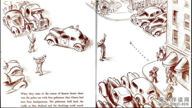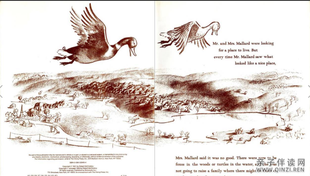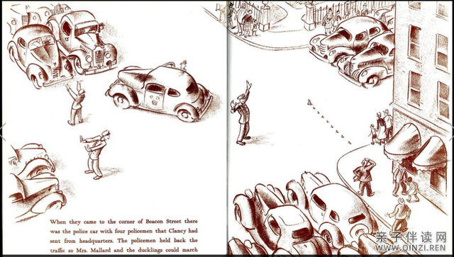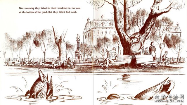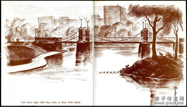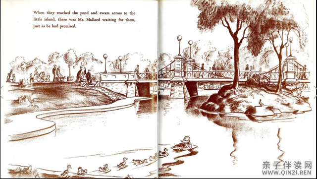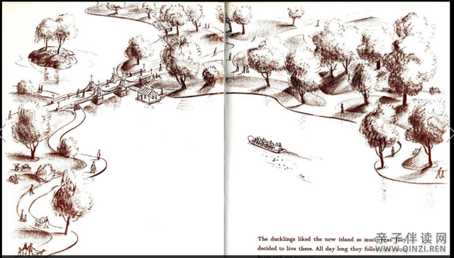 关于这本绘本还有一个制作上小趣闻,你猜猜看为什么《让路给小鸭子》的这本绘本中只有棕色白色这两种颜色,其实罗伯特在作画的时候给画面上的公园、天鹅、游艇都上了漂亮的颜色。但是全彩印刷太贵了,他为了节省印刷成本,不得不采用单色印刷,不过他并没有用常用的黑色,而是选择了棕色,棕色不但看起来温暖,还很接近鸭子的皮毛颜色。谁能想到这样一位绘本大师还有发愁印刷费的窘境。但是单单从这个细节就能看出,罗伯特对于绘本的创作和制作细节,真的是十分认真,所以绘本作品也是公认的高品质。