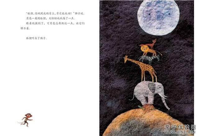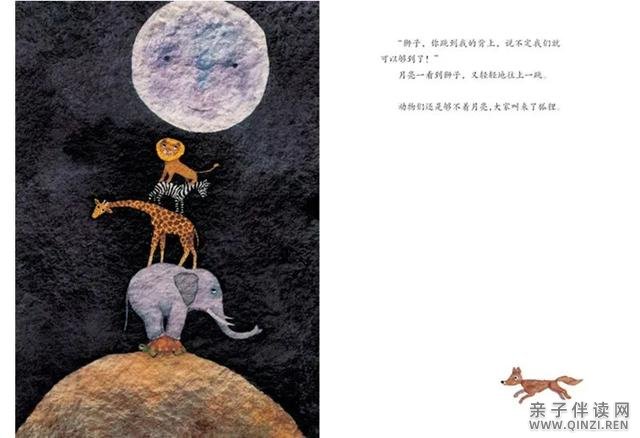 小动物们对月亮的味道充满好奇,特别想知道它吃起来是什么味道。但是他们都够不着月亮。