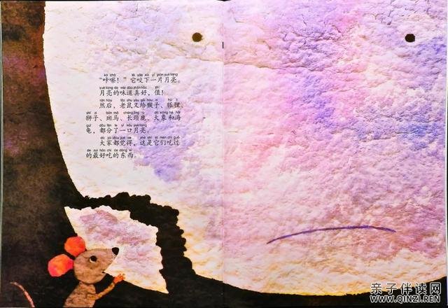 此外这本书的作者在创作时特别有创意,书里的那轮月亮是作者将纸揉的皱皱的创作出来的,为了让月亮的凹凸不平,看上去更加真实,他还特地在画的对面打光,使褶皱纸张在光影的作用下形成一种坑坑洼洼的状态,就像是月球表面的样子,是不是特别有创意。