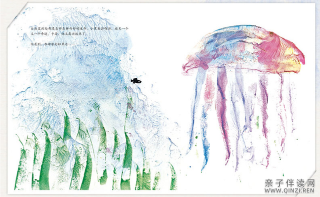 而在绘本《小黑鱼》中李欧•李奥尼又一次改变了创作方式,他用水彩和他拓印创造了一个让人目眩神迷的海洋世界,先把水彩颜料调得特别的稀,用来画背景,把海水那种淡而透明的感觉表现出来,再用印章把一个海洋生物拓印在背景上面,通过疏、密、轻、重的对比来表现海底生命的自由和美好。