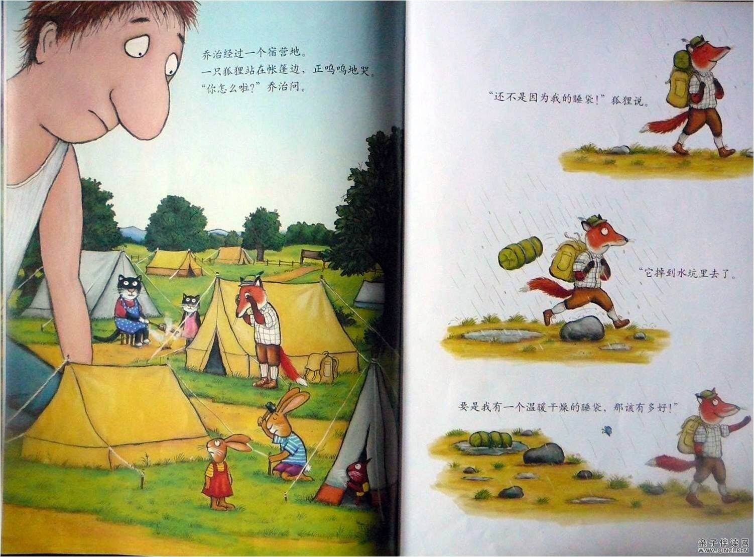 乔治经过一个宿营地。一只狐狸站在帐篷边,正呜呜地哭。“你怎么啦? ”乔治问。“还不是因为我的睡袋! ”狐狸说。“它掉到水坑里去了。要是我有一个温暖干燥的睡袋,那该多好!”