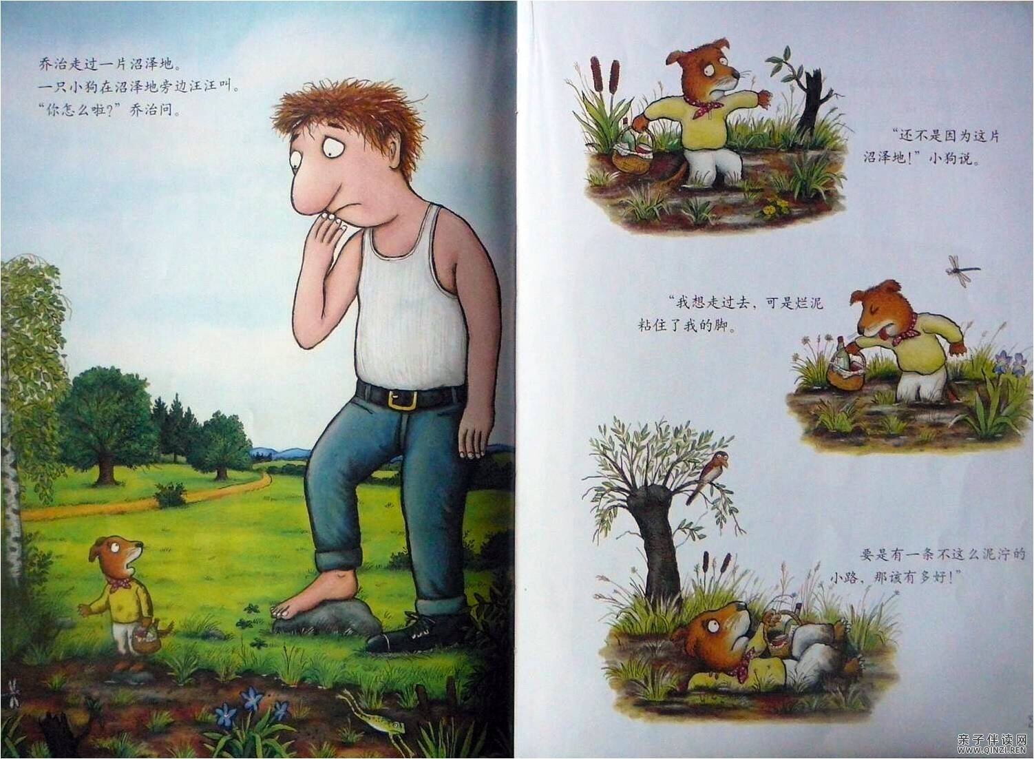 乔治走过一片沼泽地。一只小狗在沼泽地旁边汪汪叫。“你怎么啦? ”乔治问“还不是因为这片沼泽地! ”小狗说。“我想走过去,可是烂泥粘住了我的脚。要是有一条不这么泥泞的小路,那该多好!”