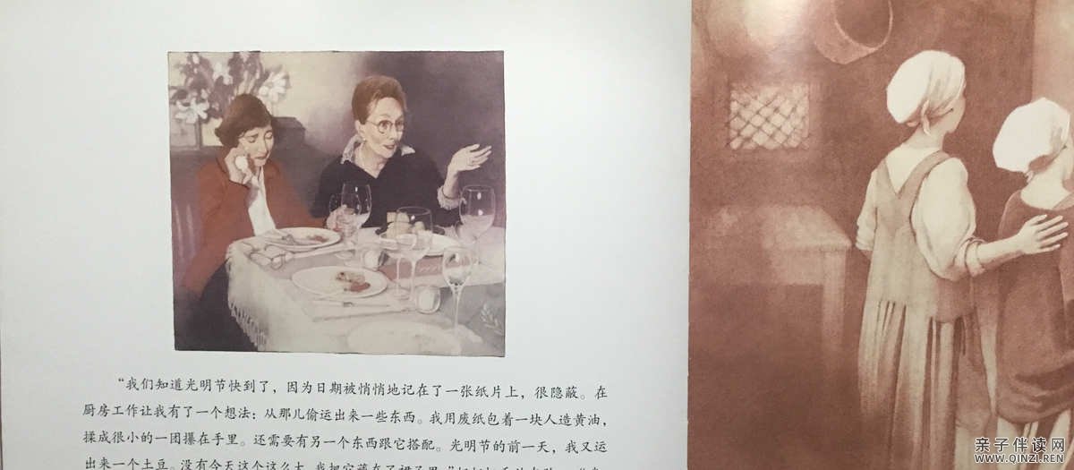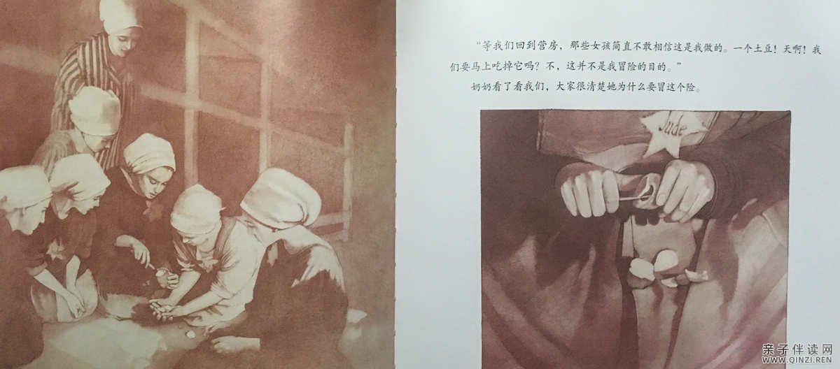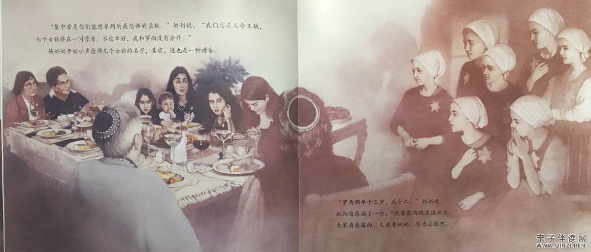 “年龄大一点的女人去田里干农活。”奶奶的继续说, “萝西和我留在厨房。我们又瘦又小,能被留下来帮厨真是个奇迹。”奶奶向后靠着椅背上,闭上眼睛,脸颊颤抖着。“那么多美食,没有一丁点儿属于我们。”我看了一圈餐桌,虽然已经饱了,可是妈妈准备的美食还剩下好多。我根本无法想象挨饿是什么感觉。