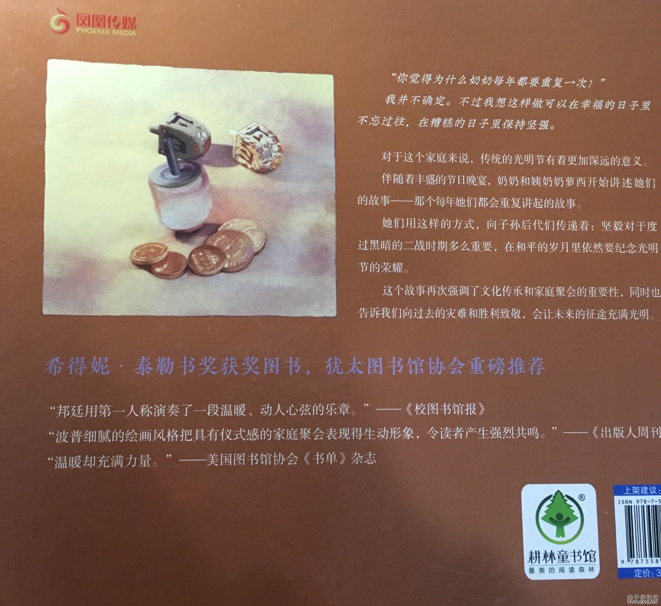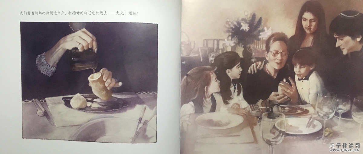 “就像今天这样,我挖空的那个土豆。”奶奶凝视着手里的土豆, “我们把挖出来的土豆瓤都吃掉了。”南斯突然说: “生的?太好笑了! ”奶奶笑着点点头。“非常美味!比任何糖果都好吃。接着,我们把那块人造黄油塞进土豆里,又从萝西的裙子上拽下一根线头捻成灯芯,点燃。”她顿了一下, “就这样,我们拥有了一支光明节蜡烛。”“那支光明节蜡烛点亮了我们, ”奶奶说着,眼角泛起泪光, “它把我们照得像星星一样亮。”碧丝疑惑地问: “它是怎么点亮你们的呢,奶奶? ”“在我们的信念里,亲爱的,也在我们的心里。”