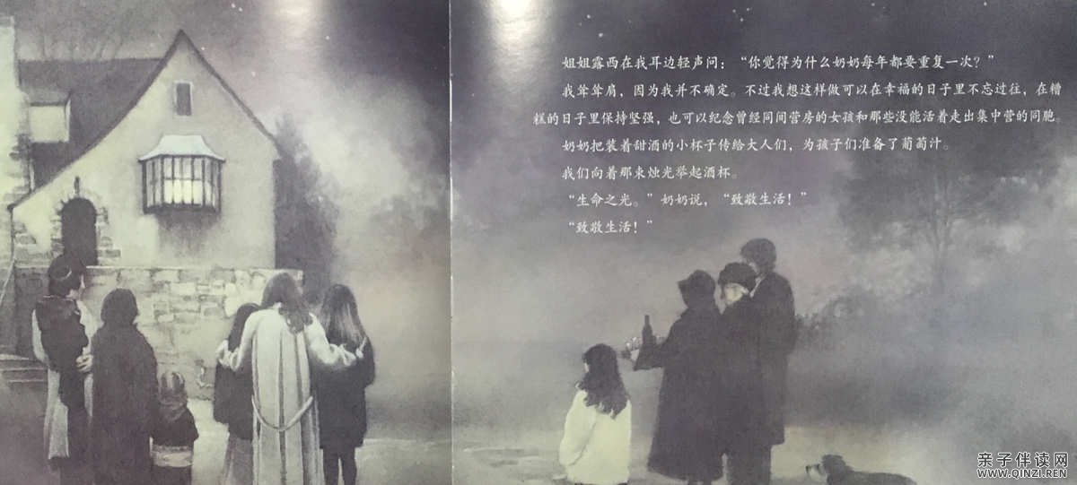 奶奶擦干眼泪,大家站起身来。“我可以来拿它吗? ”我问道。“可以。”奶奶说。我把这支特殊的蜡烛放在窗前,它的光映在黑漆漆的玻璃上。爸爸关掉屋子里的灯,我们一起走出门。九支烛台上的蜡烛已经燃烧殆尽,窗前这束火光却依然明亮。