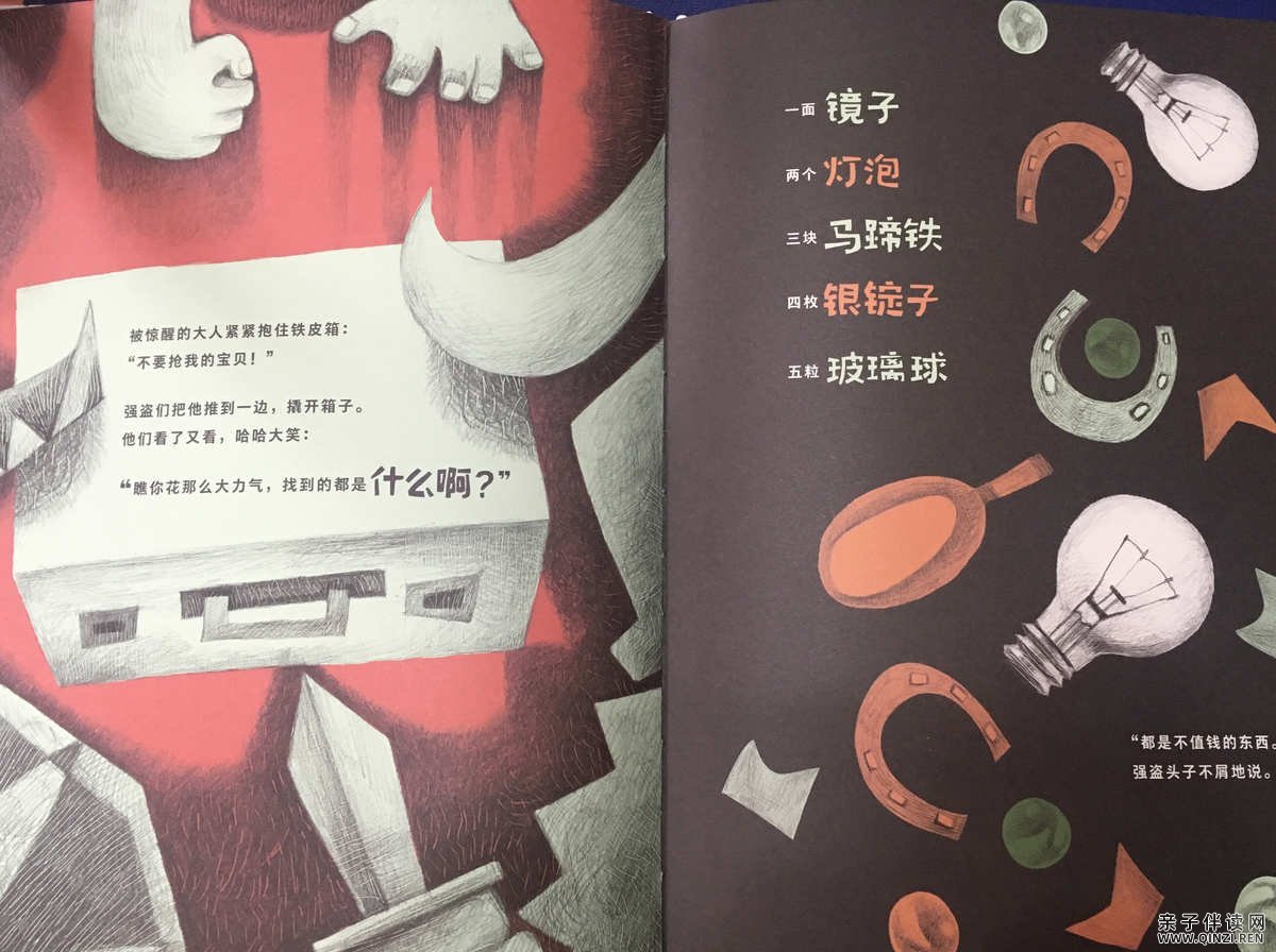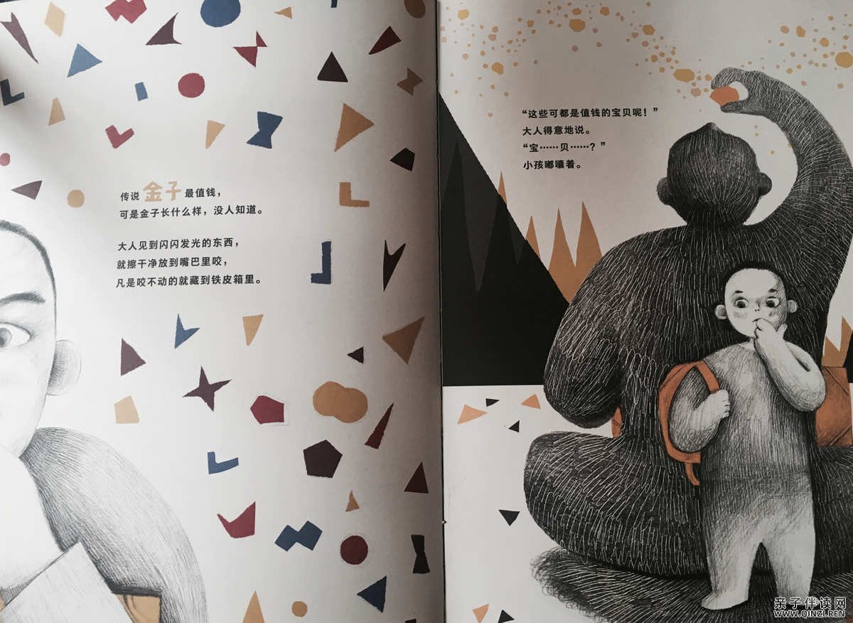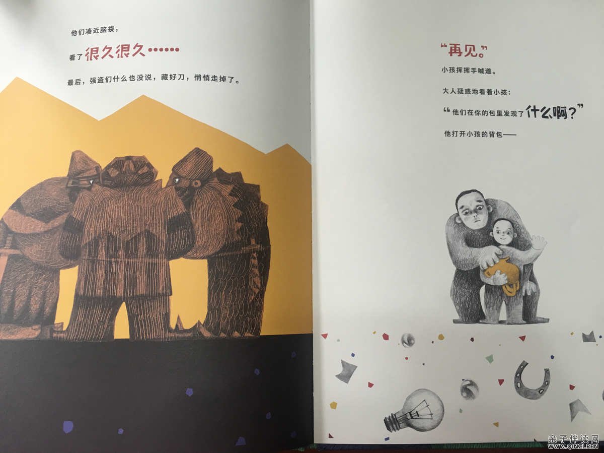大人拎着一个铁皮箱,四处寻找宝贝。小孩背着一个又扁又脏的小背包,连自己要去哪儿也说不上来。太阳照着,大人的影子长长的,小孩的影子短短的。