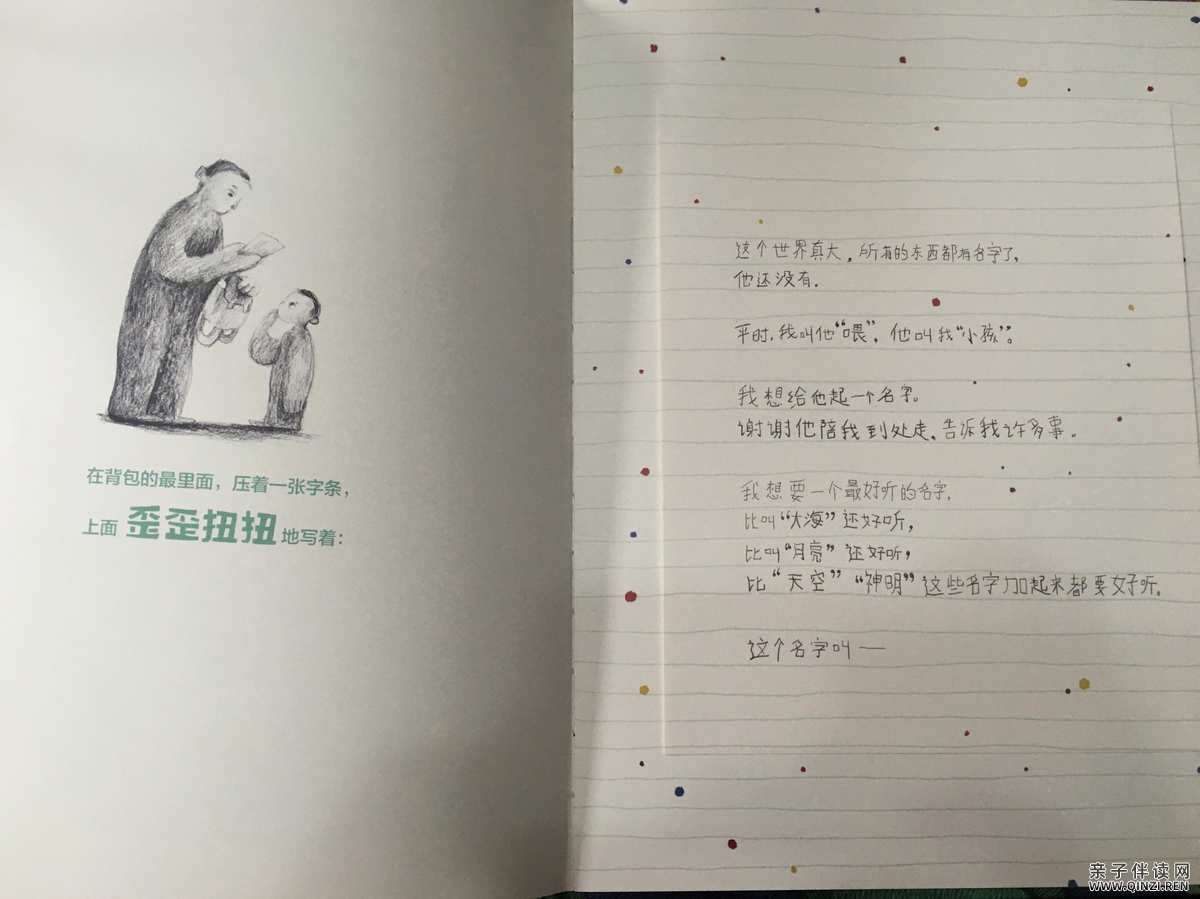 这个故事你妈妈并没有出现,我想他应该是在故事外面悄悄观察着大人和孩子,再把他们的故事写下来。那歪歪扭扭的两个字“爸爸”,似乎预示着下一个故事即将开启:心理学研究认为,孩子在儿童期和青少年期对父亲的依恋比婴儿期更强一些。那么让我们期待着,当大人熟悉了他的新名字,当孩子又长大一些,那时会有怎样的故事发生吧。