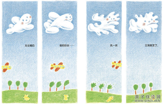 我们先来简单回顾一下,云娃娃是一朵云,他看到任何物体的时候都会思考它们的形状,云娃娃发现其他物体有固定的形状,可是自己却没有。于是他开始尝试模仿其他物体的形状,但无论模仿得多像,只要风一吹就没有了。在做了很多尝试之后,突然听到小朋友对他的赞叹和夸奖,他对自己有了全新的理解,云娃娃终于意识到没有形状就是自己的形状,他也不再为没有形状而苦恼了。