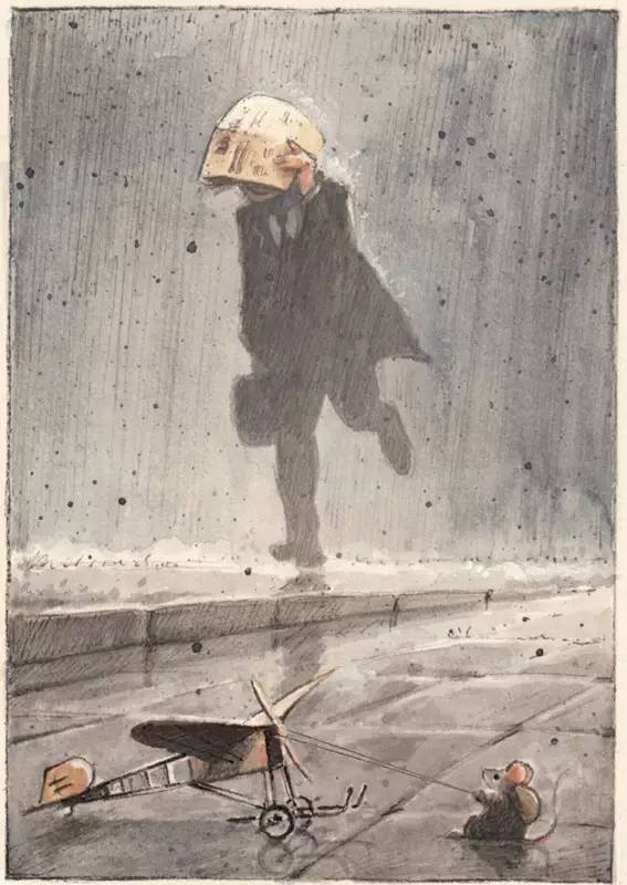 唯一不时出现在他面前的,只有匆匆行过的路人们,他们用报纸挡着雨,皮鞋踩在路面上溅起片片水花。小老鼠浑身都湿透了。
