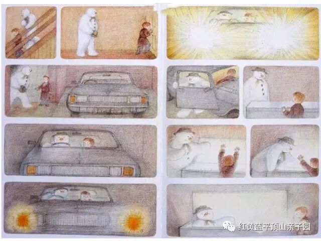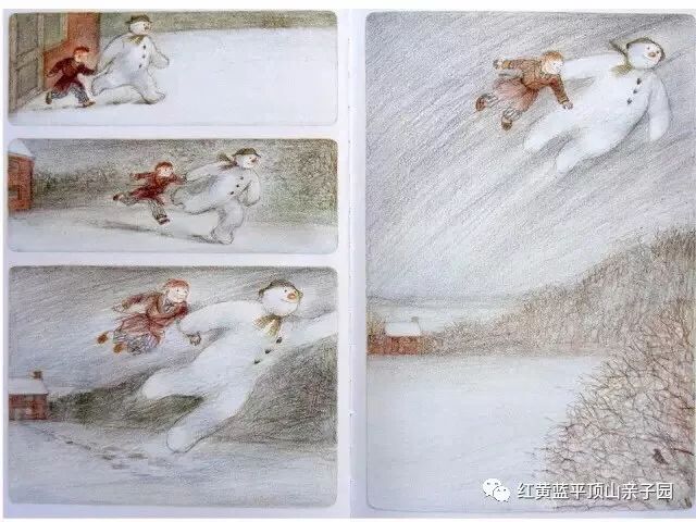 这个发生在寒冷的冬夜里的幻想故事太迷人了,雪住了,男孩发现门外被一片奇异的光照亮了,那个白天他堆的大雪人竟然动了起来!于是,他把雪人让进屋来,男孩家里的一切都让憨态可掬的雪人好奇,他看完梵高的《向日葵》,又盯着杯子里男孩爸爸的一副假牙发了一会呆,然后在天亮之前,看上去那么笨拙的雪人竟扯着男孩就飞上了漫天雪花的夜空……