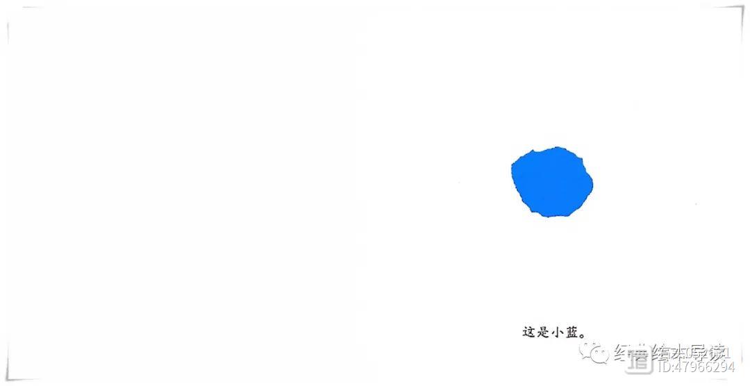小蓝和小黄是用蓝颜色和黄颜色的色纸撕出来的圆纸片,注意是用手撕,不是用剪刀剪,因为边缘还带着不整齐的毛边。而扉页中的小蓝与小黄,看上去就像两大滴在白纸上的油漆,一蓝一黄两个色块!