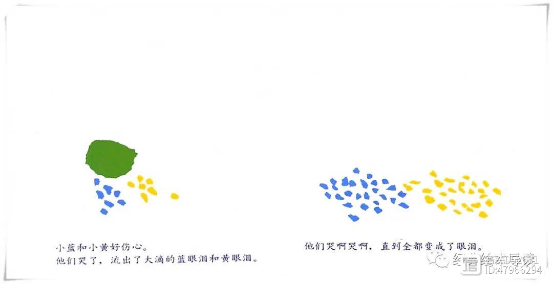原文:小蓝和小黄好伤心。他们哭了,流出了大滴的蓝眼泪和黄眼泪。他们哭啊哭啊,直到全部变成了眼泪。