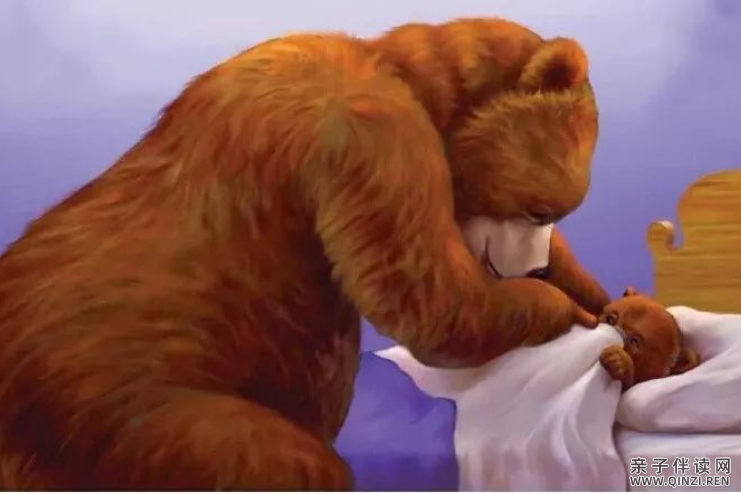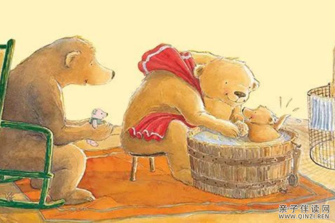 熊爸爸并不生气,他不紧不慢地,一边给熊宝宝洗澡,再穿上睡衣,一边不停地逗熊宝宝,要求熊宝宝给他一个吻,还不断地启发熊宝宝。