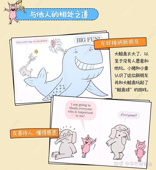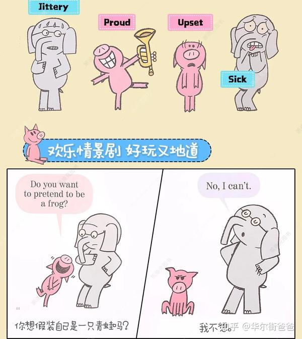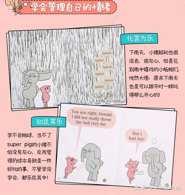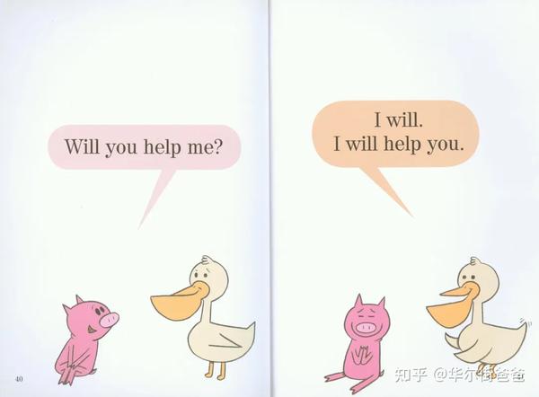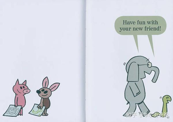 绘本中采用画风简洁的两个小主角小猪佩吉(Piggie)和小象杰拉尔德(Gerald)活泼可爱的形象,宝宝看到后就喜欢上了。