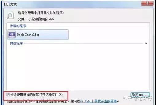 然后,右击后缀为 .dab的点读包,选择 打开方式 -> 其他应用,定位到刚才查到的小达人安装路径(上图的例子是C:MyClient),找到 InsBook.exe,双击确认即可。