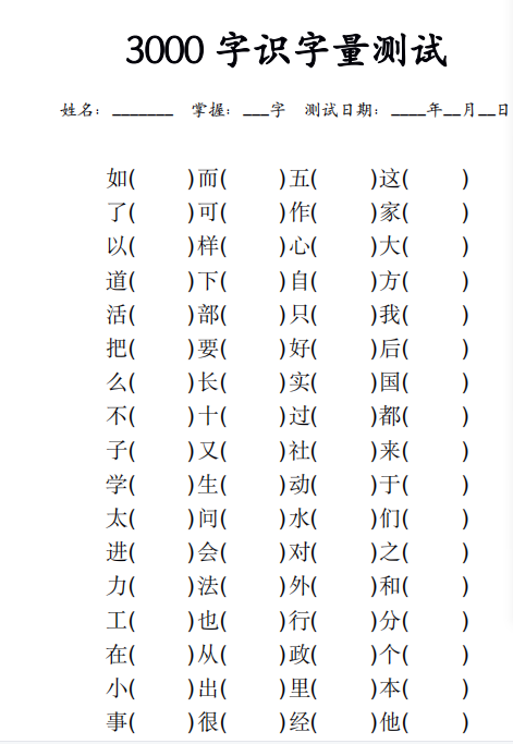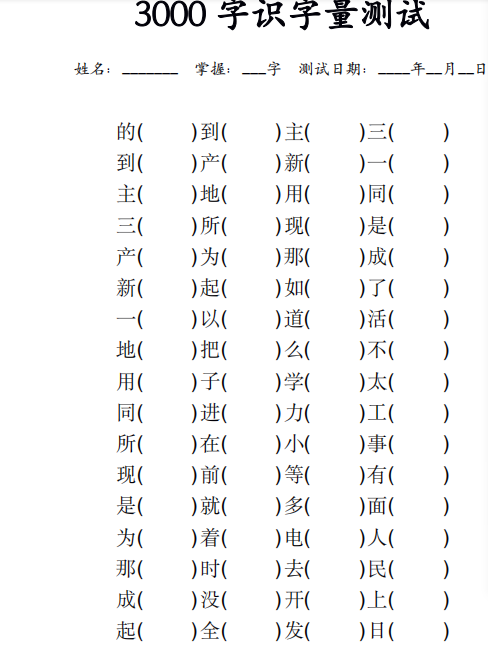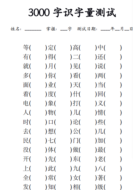 3000字儿童识字测试表,你家孩子都会读吗?孩子每天都在识字,家长却不知道孩子认识的有多少?这套儿童识字测试表可以快速测试。识字量决定孩子小学的阅读能力和学习成绩,家长一定要重视起来!!会认的括号里画勾或者画上自己喜欢的符号。 未经允许不得转载:无忧学习网 » 蓝猫趣味识字