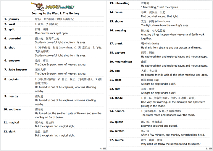共108集,每集5-7分钟,一集讲述一个故事,故事完整适合孩子及成人磨耳朵,学英语.四舍五入等于牛津阅读树7-8级的水平 ① 一起大幅提升英语,你准备好了么? ② 本期up分享108集☆英文版西游记丨附配套资源(pdf文稿+生词+练习+音频) ☆ 永恒经典~熟悉的故事·不同的感觉 ☆☆ 学习内容 ☆ 视频·中英字幕 ☆ 音频丨适合反复听写 ☆ PDF文稿丨精选绘本文稿 ☆ 词汇+词汇例句丨来源于视频 ☆ 练习 ③ 相信爱学习的你。