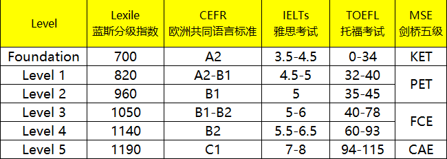 ReadingExplorer 从Foundation开始一直到Level 5,一共六本书。每本书对应的难度水平如下表,可以参考一下:
