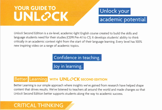 Unlock 第二版提供了6个级别的学习(基础级-第五级),每个级别两本书: