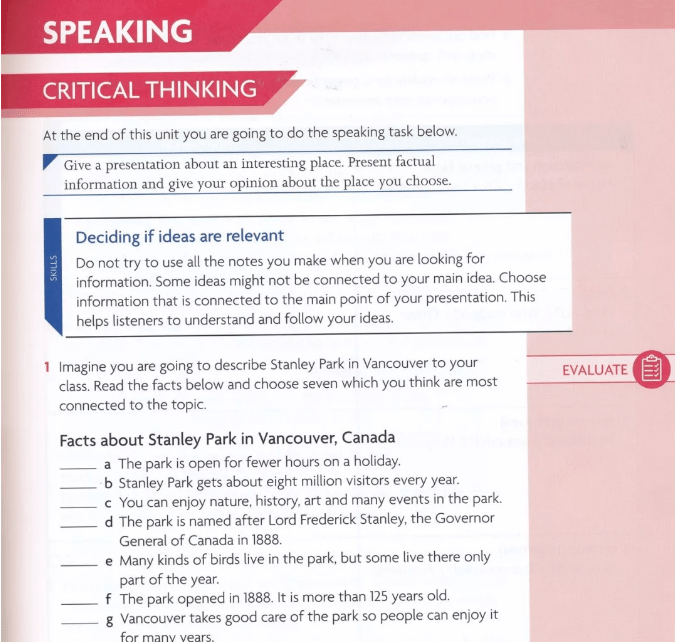 比如要描述温哥华某个公园,在10项关于它的facts中,我们要评估哪些跟我们想表达的核心思想有关,而与主题不符的就要去掉。这样的一段口语表达才主题明确,观点突出。